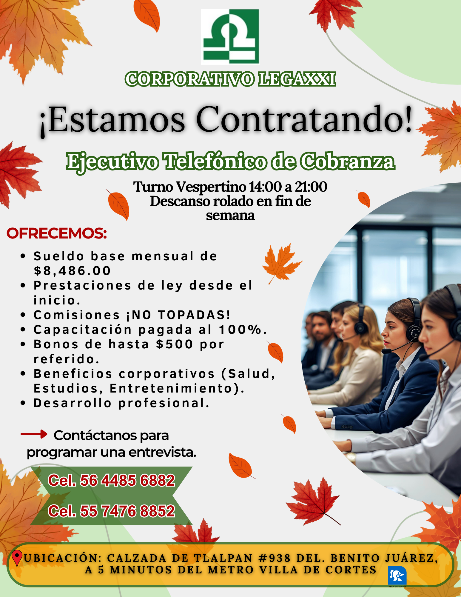 Ejecutivo Call Center Cobranza // Turno Vespertino // CDMX // Contratación inmediata - Capacitación pagada // Empleo por las Tardes